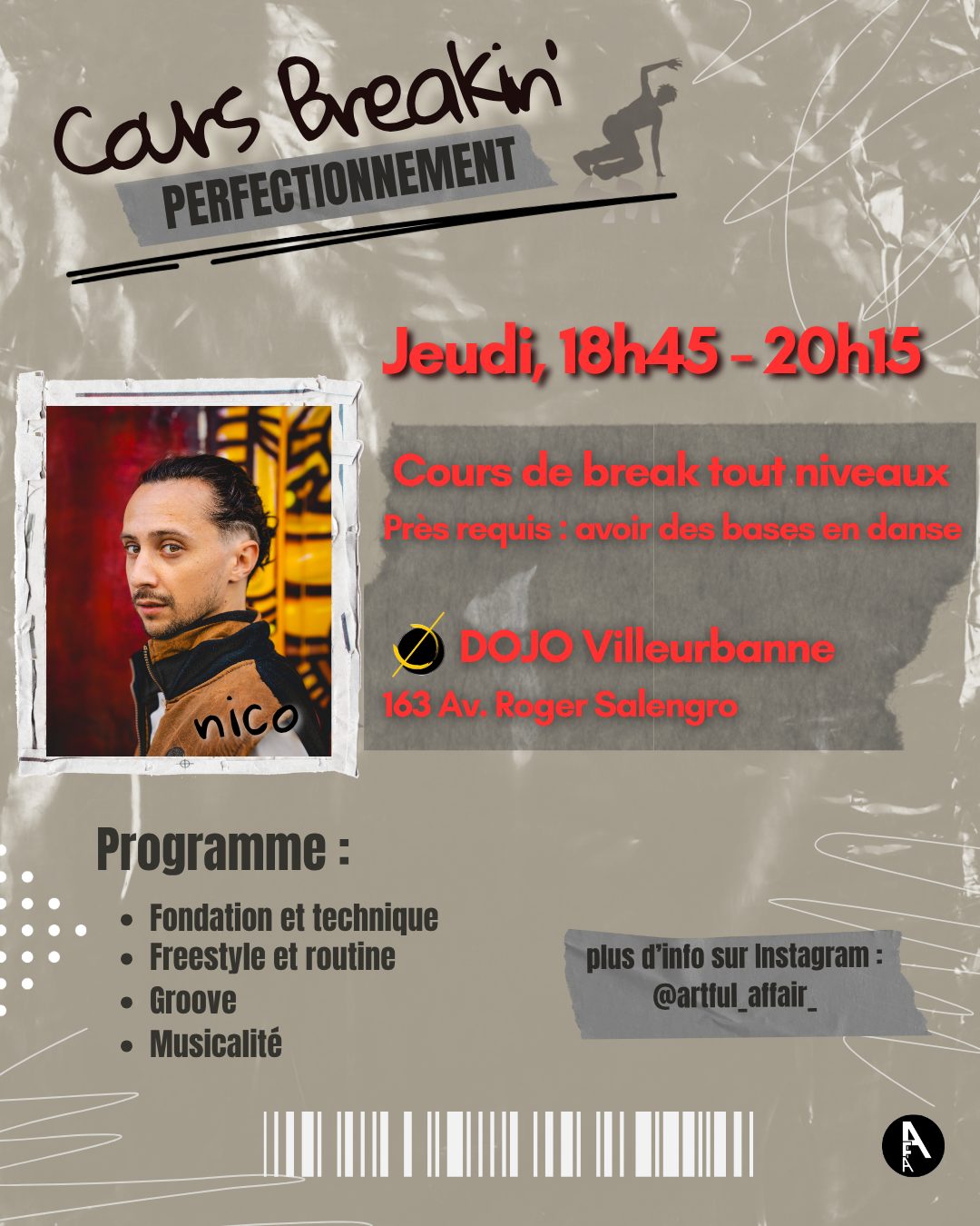 DOJO Villeurbanne – 163 Av. Roger Salengro Tous les jeudis de 18h45 à 20h15 Reprise le 4 septembre Cours d’essai : 5€ Inscription à l’année : 350€ Animé par Nico (@nicolasdtrd) En collaboration avec @artful_affair_ #Breakdance #BBOY #BGIRL #HIPHOP #Danse #Lyon #Villeurbanne.